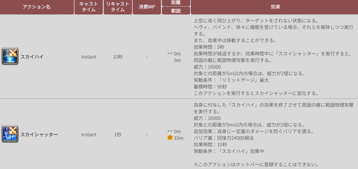 効果時間が経過するか、効果時間中に「スカイシャッター」を実行すると、周囲の敵に範囲物理攻撃を実行する。