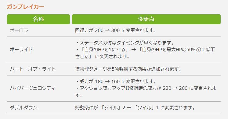 アクションの使いやすさの向上を目的として「ダブルダウン」のコストを変更しました。この変更により「バーストストライク」と「ハイパーヴェロシティ」の実行回数が増加するため、「ハイパーヴェロシティ」の威力を引き下げましたが、この調整を行ったうえでもガンブレイカー自体は以前より火力が上昇しています。