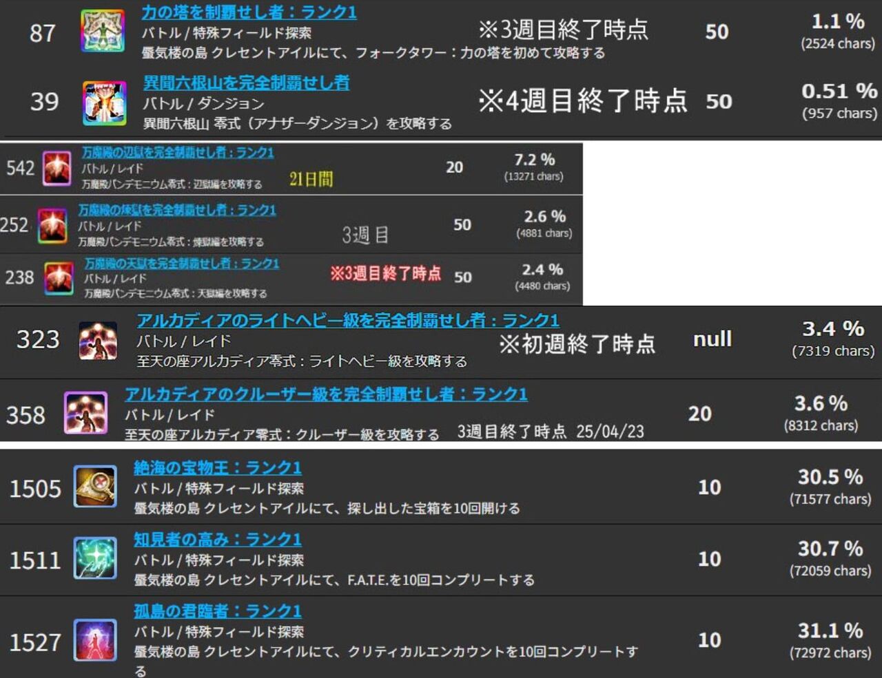 3週目終了時点でクリアアチーブは2524キャラの1.1%となっています